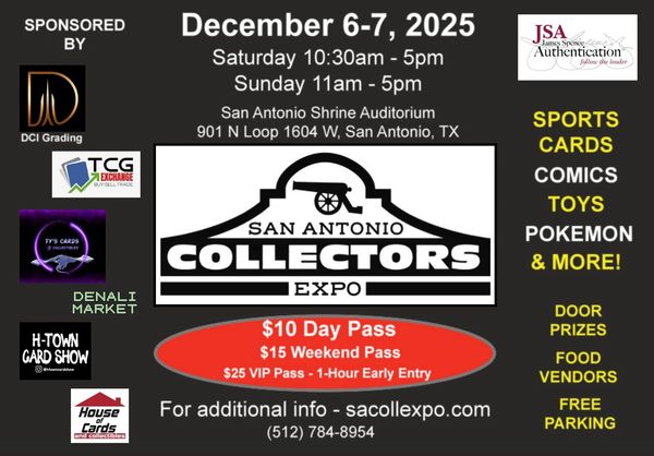 SA Collectors Expo will be giving away 50 Sports or Pokemon packs to the first 50 paying customers each day at SA Collectors Expo! Come early for great deals and fun!